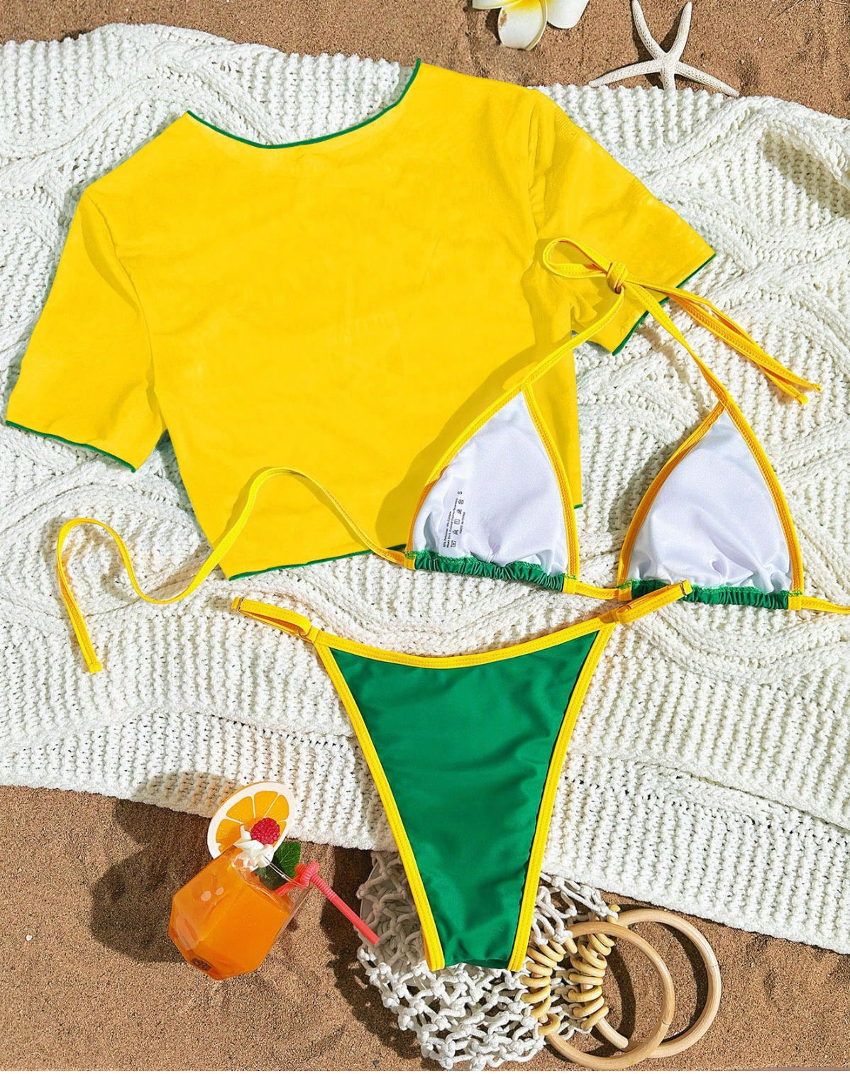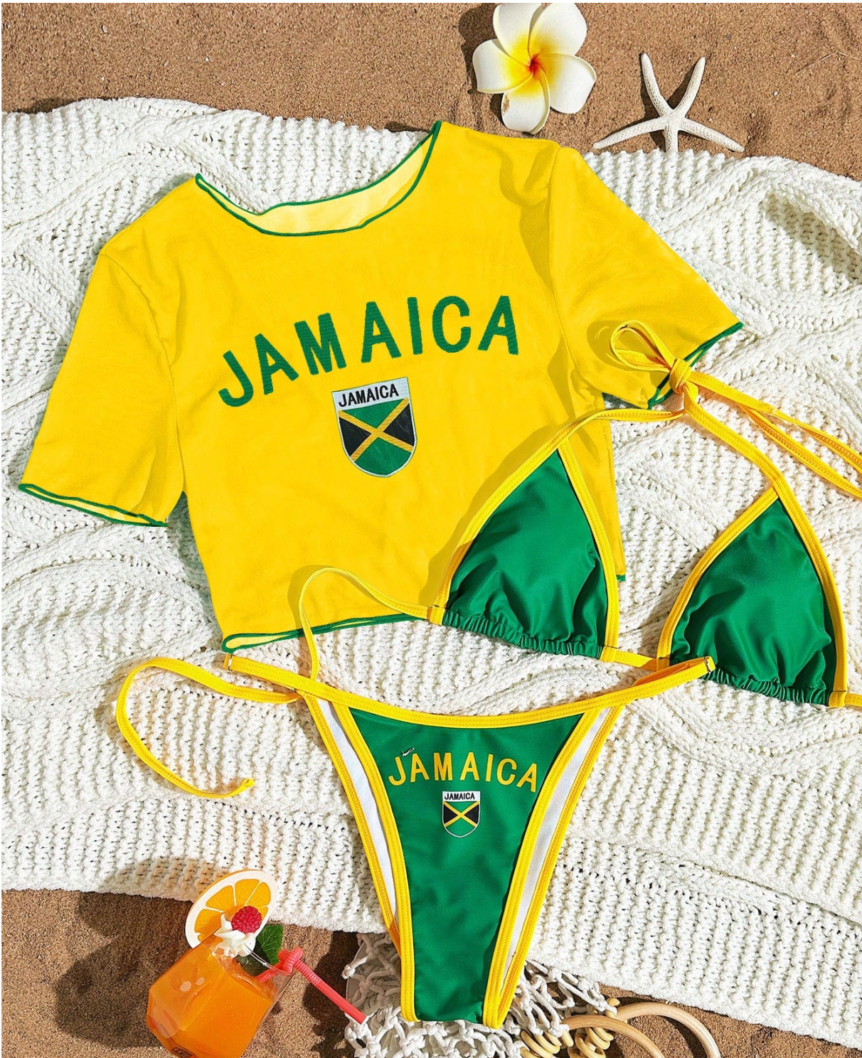 This bold three-piece set channels the vibrant spirit of Jamaica with a traditional bikini paired with a striking mesh cover-up top, both adorned with the iconic Jamaica flag. Perfect for making a fearless statement at the beach or poolside, it blends cultural pride with daring style.