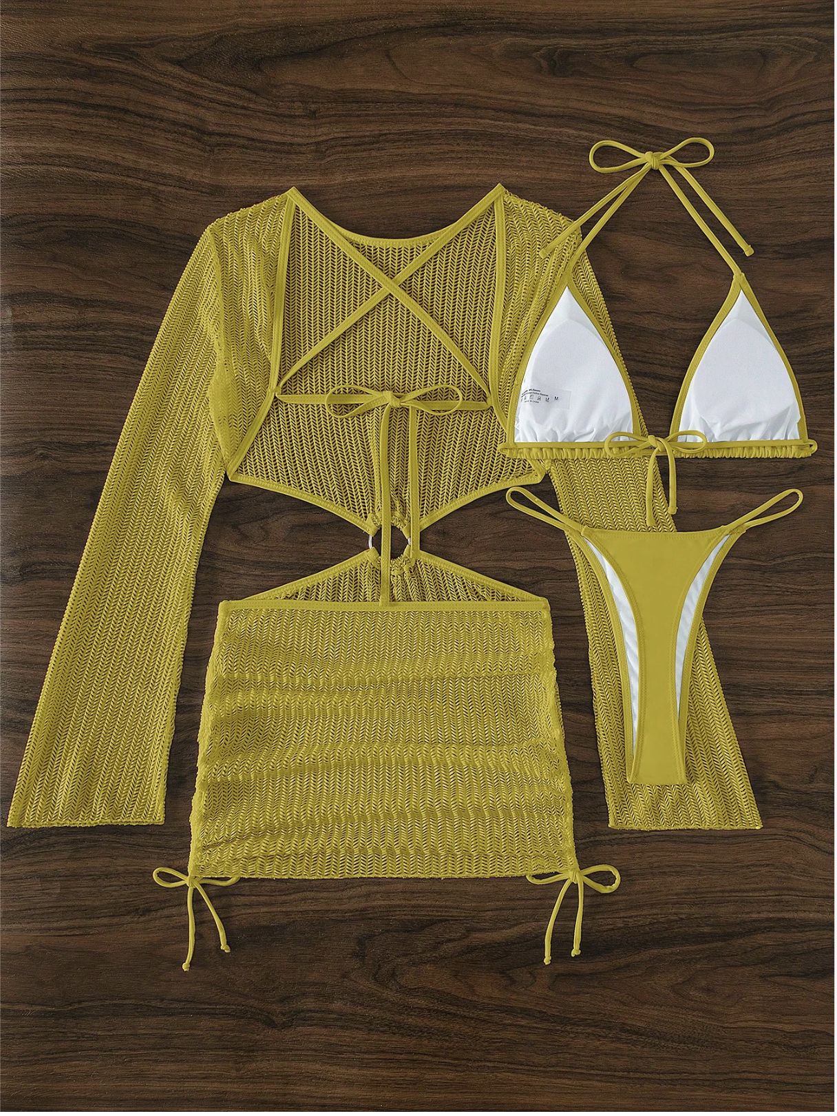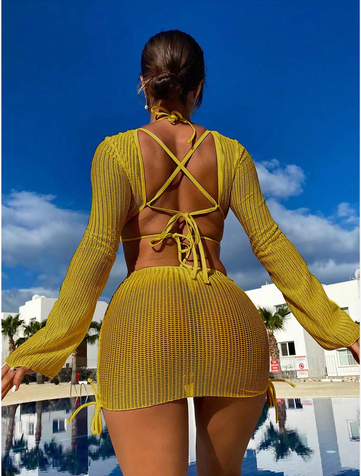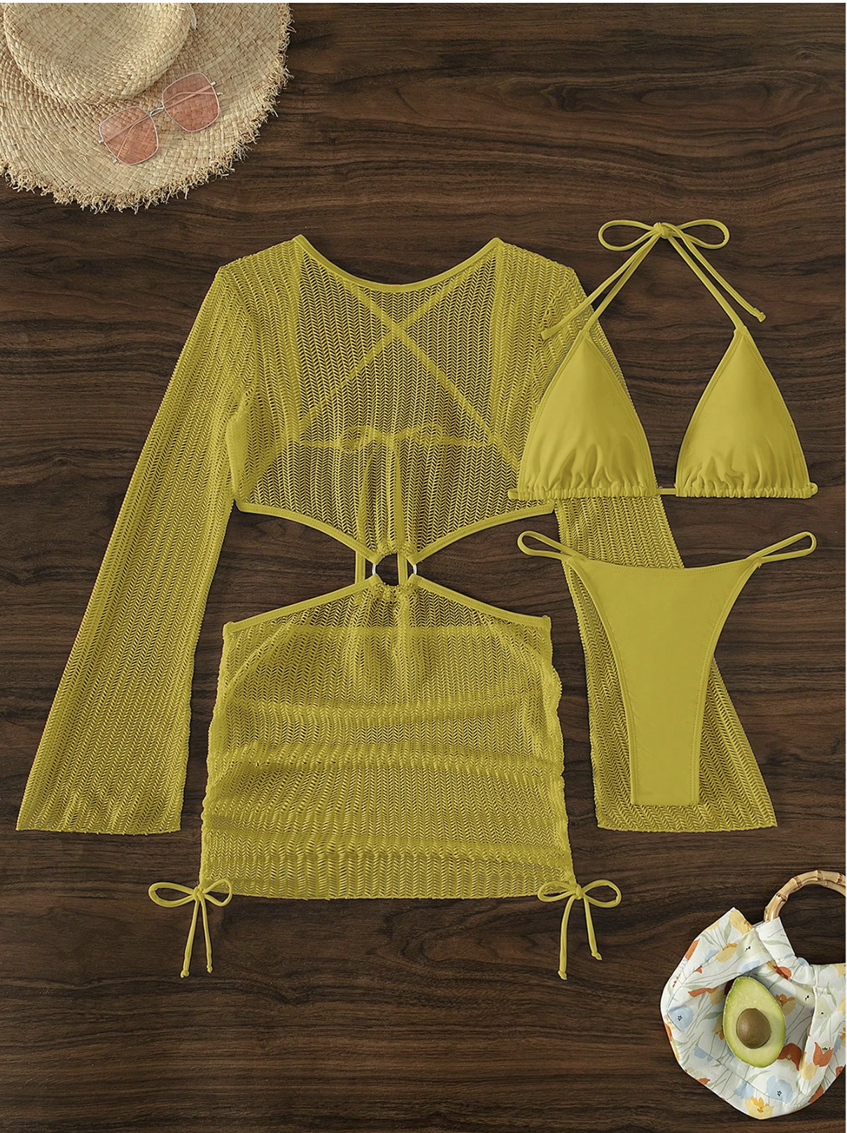 The Alley three-piece swimsuit set combines a traditional thong bikini with a daring mesh long-sleeve mini dress, creating a striking look that balances boldness and allure. Perfect for those who want to showcase confidence and style, this set offers a unique way to stand out at any beach or pool event.