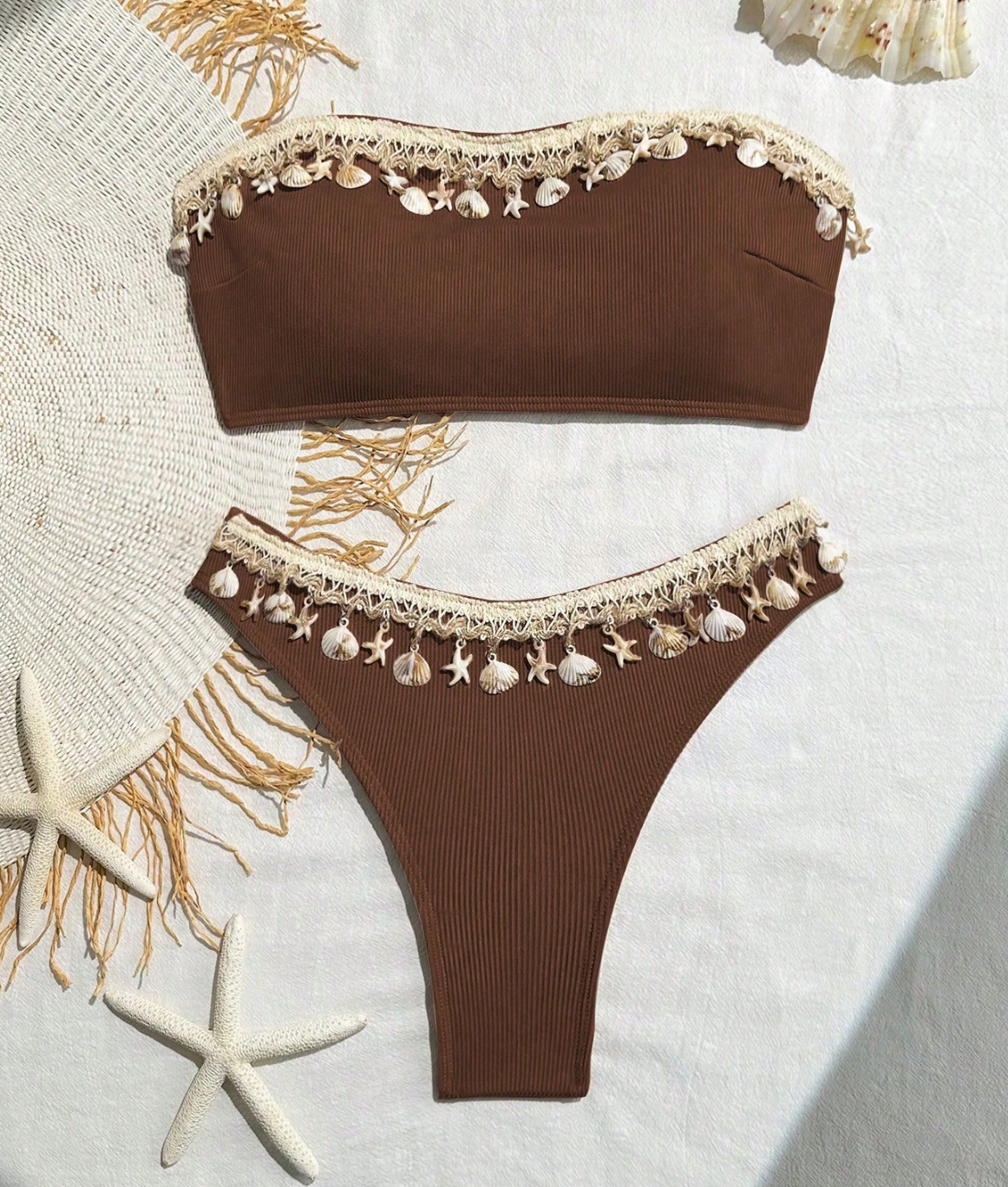 Make a bold statement with the Chey two-piece tube bikini, featuring eye-catching shell accents that add a touch of beachside allure. Its sleek, strapless design highlights your confidence while providing a flattering fit. Perfect for turning heads by the water, this daring bikini combines style and seaside charm effortlessly.