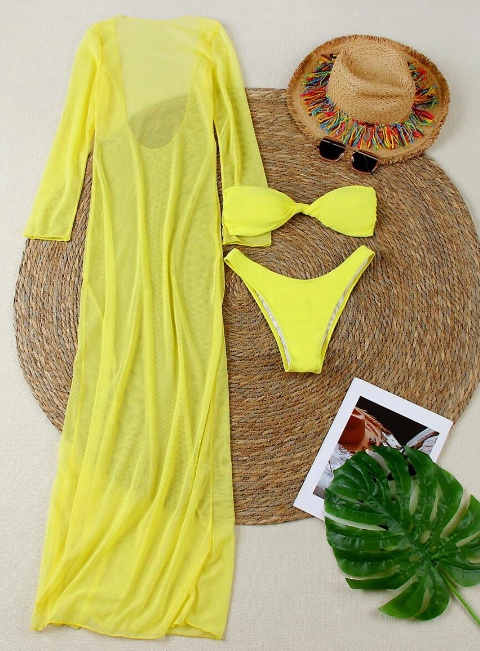 Experience ultimate poolside glam with Elle! This three-piece swimsuit set includes a flattering bandeau two-piece bikini and a stunning sheer floor-length dress. Effortlessly transition from beach to bar while turning heads with this must-have set.