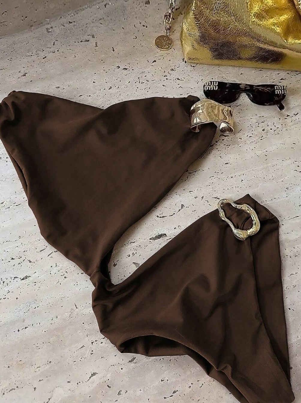 The Kimona is a classy one piece swimsuit designed with an off the shoulder style and a gold cuff for added comfort and modesty. Its stylish design makes it a perfect choice for any occasion. With this swimsuit, you can look and feel confident while enjoying your time by the water.